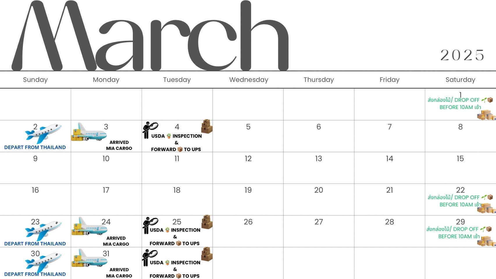 เราจะมีอย่างน้อย 2 เที่ยวบินต่อเดือน ระยะเวลา : 3-4 วัน จากประเทศไทยถึงฟลอริดา จากนั้น การจัดส่งจะถูกส่งต่อไปยัง UPS ปลายทางที่รับสินค้าจะขึ้นอยู่กับวิธีการจัดส่งที่คุณเลือก *ราคาสินค้าทางอากาศไม่รวมค่าขนส่งภายในประเทศ เราคือยินดีให้คำปรึกษา ราคาขนส่งสินค้าทางอากาศขึ้นอยู่กับน้ำหนักขนาดของสินค้า